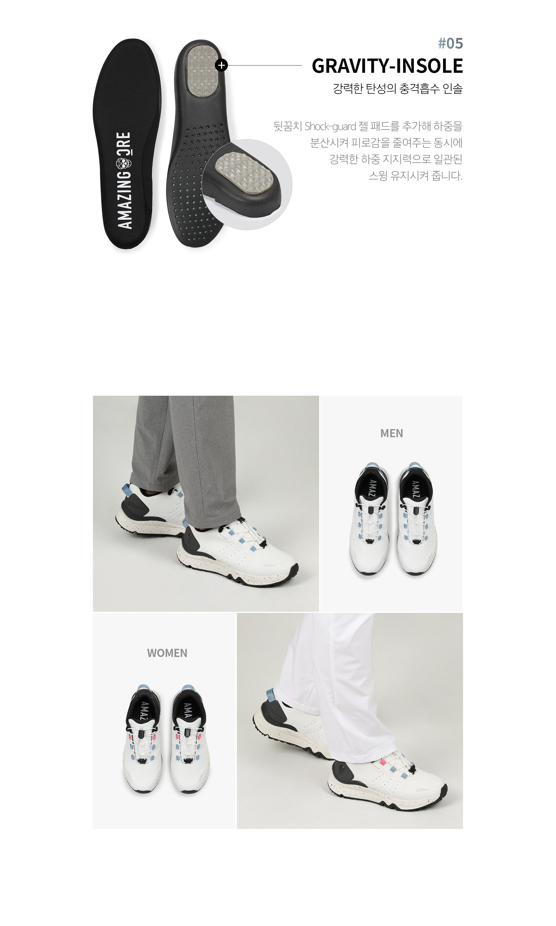 - 알렉스(ALEX)의 외곽선을 형상화 시킨 갑피 디자인과 힐컵의 사출물, 힐카운터의 부속이 어드레스 시 안정감을 높여줌